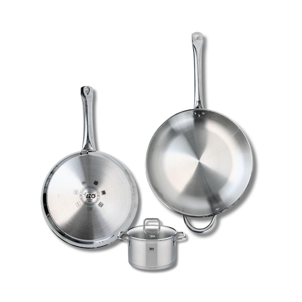 Découvrez l'ensemble de cuisine Elo Profi Citrin, comprenant deux poêles de cuisson de 28 et 32 cm, ainsi qu'un faitout de 14 cm, parfait pour tous vos besoins culinaires. Fabriqués en inox de haute qualité, ces ustensiles garantissent une robustesse exceptionnelle et une excellente conductivité the