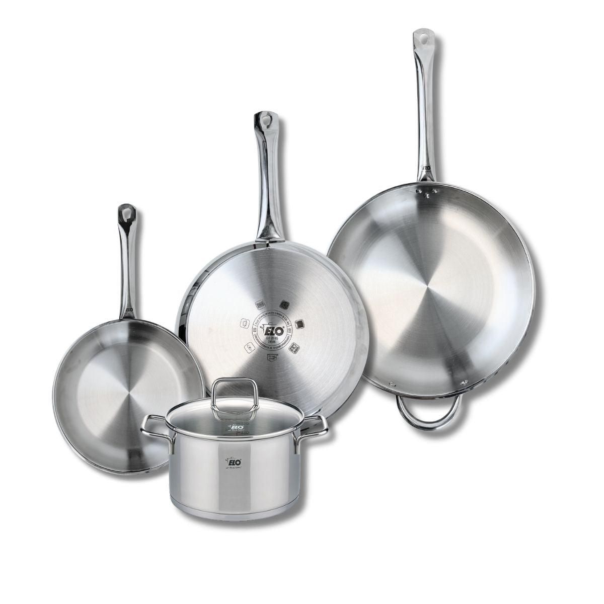 Découvrez l'ensemble de 5 pièces Elo Profi Citrin, conçu pour répondre aux besoins des chefs amateurs et professionnels. Cet ensemble comprend trois poêles de cuisson de 24, 28 et 32 cm, ainsi qu'un faitout de 20 cm, tous fabriqués en inox de haute qualité, sans revêtement et sans PFAS, garantissant