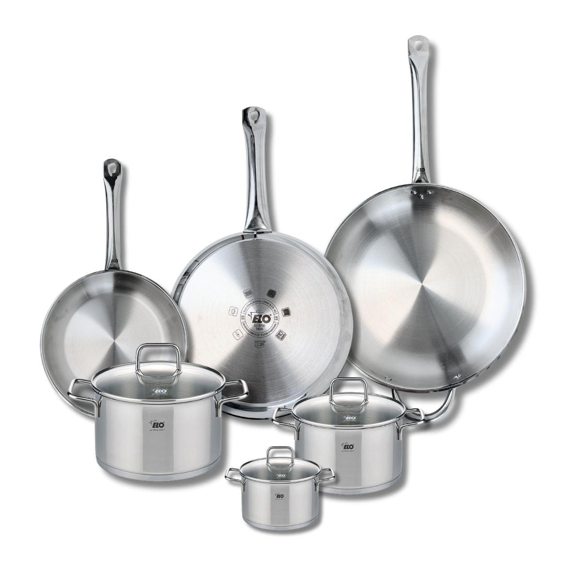 Découvrez l'ensemble de 3 poêles de cuisson et 3 faitouts Elo Profi Citrin, une batterie de cuisine qui allie performance et élégance. Fabriqués en inox robuste, ces ustensiles sont idéaux pour les cuisiniers amateurs comme pour les chefs confirmés. Les poêles de 24, 28 et 32 cm sont parfaites pour