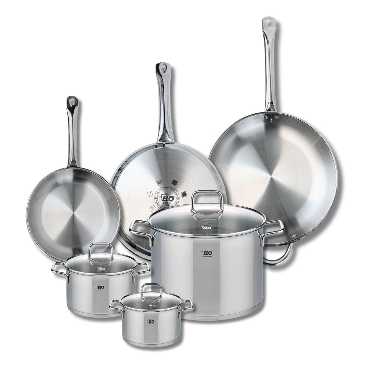 Découvrez l'ensemble de cuisine Elo Profi Citrin, composé de 9 pièces essentielles pour tous vos besoins culinaires. Cet ensemble comprend trois poêles de cuisson de 24, 28 et 32 cm, ainsi que trois faitouts de 14, 16 et 26 cm, tous fabriqués en inox de haute qualité. Conçus sans revêtement et sans