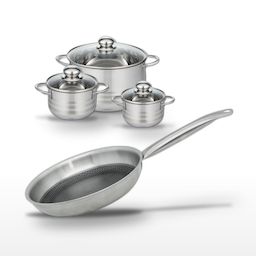 - DESCRIPTION : DESCRIPTION : Ensemble Elo Relief Solution avec poêle 24 cm et trois faitouts en inox. Idéal pour une cuisson saine et homogène sans PFAS.