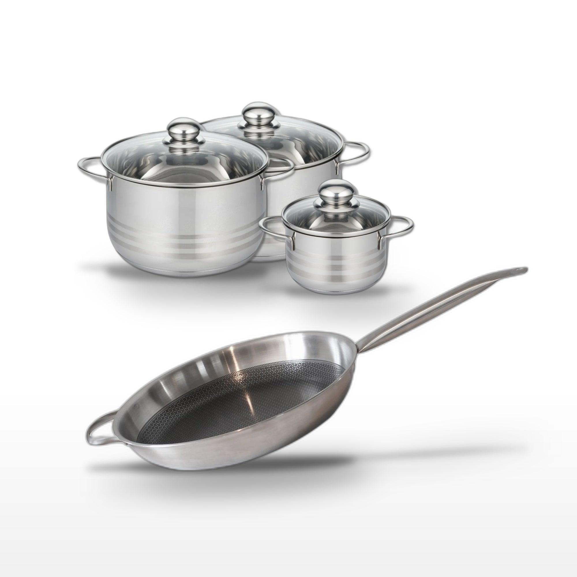 - COMPOSITION : Fabriqué en acier inoxydable 18/10, avec revêtement minéral sans PFAS. Inclut une poêle et trois faitouts.