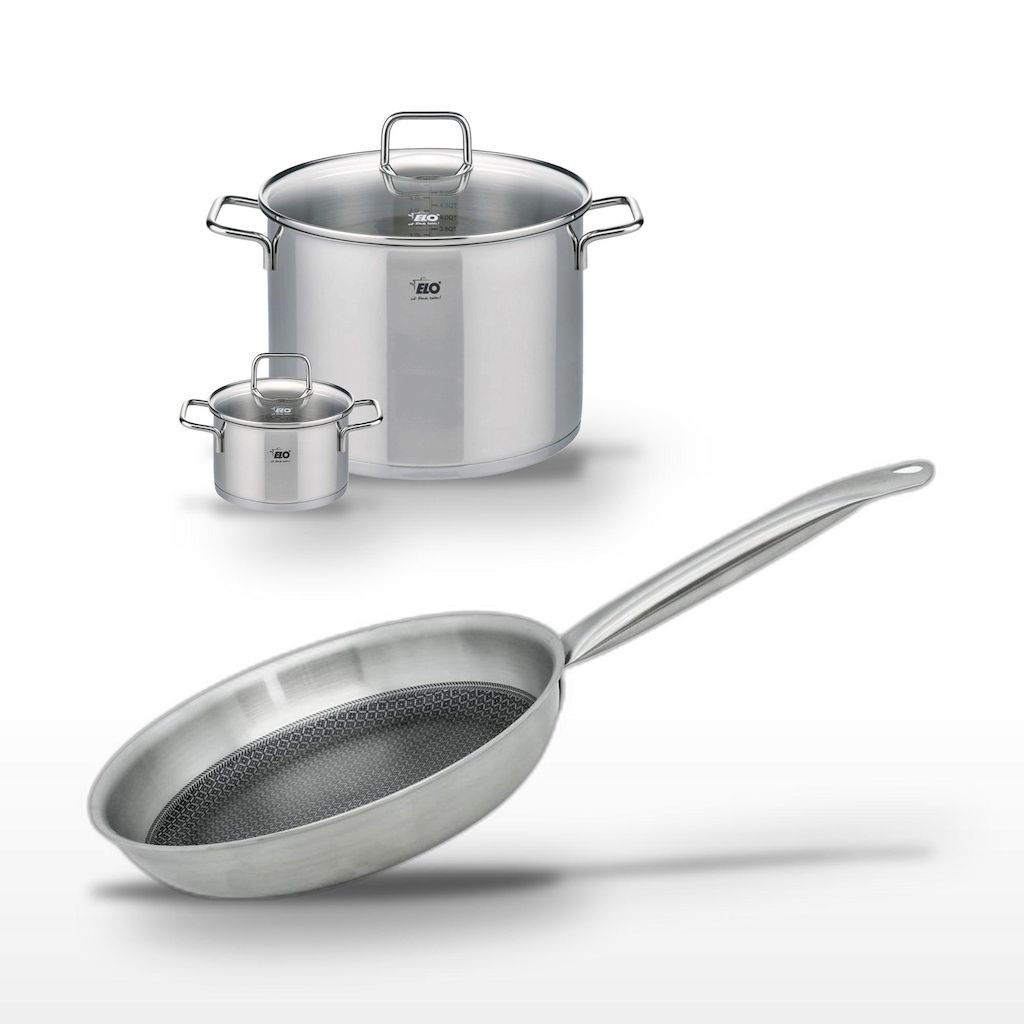 DESCRIPTION : Profitez de deux faitouts en inox et d'une poêle antiadhésive Elo Relief Solution pour une cuisine variée et saine.PETIT + : Fond capsulé des faitouts pour une cuisson économe en énergie et préservation des vitamines.COMPOSITION : Acier inoxydable de haute qualité, verre pour les couve
