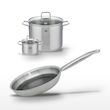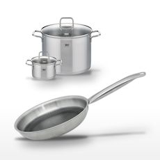 - COMPOSITION : COMPOSITION : Faitouts en inox et verre, poêle en acier inoxydable 18/10, aluminium et acier, avec revêtement ELODUR® Select.