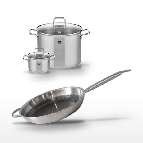 - DESCRIPTION : L'ensemble Elo Relief Solution inclut deux faitouts et une poêle en acier inoxydable, offrant une cuisson homogène et une grande résistance. Compatible tous feux, y compris induction.