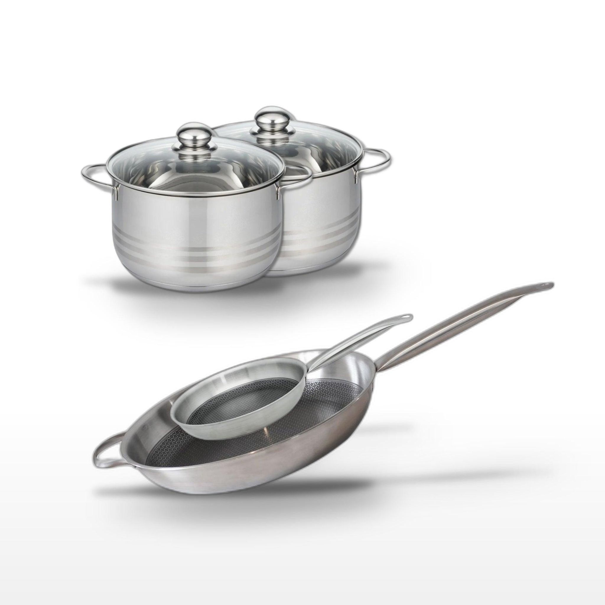 - DESCRIPTION : DESCRIPTION : Ce lot Elo Relief Solution inclut deux faitouts et deux poêles en acier inoxydable, parfaits pour une cuisson homogène et saine.