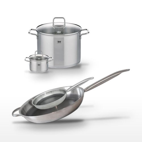- COMPOSITION : COMPOSITION : Fabriqué en acier inoxydable 18/10 et aluminium, avec un revêtement antiadhésif minéral ELODUR® Select sur les poêles, ces ustensiles assurent une durabilité et une résistance à toute épreuve.