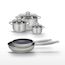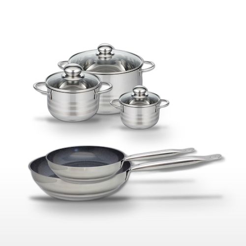 - COMPOSITION : COMPOSITION : Poêles en acier inoxydable avec revêtement sans PFAS, faitouts en inox avec couvercles en verre résistant aux chocs.
