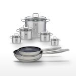 - COMPOSITION : COMPOSITION : Les poêles et faitouts sont fabriqués en acier inoxydable 18/10, avec un revêtement sans PFAS pour les poêles, et des couvercles en verre pour les faitouts.
