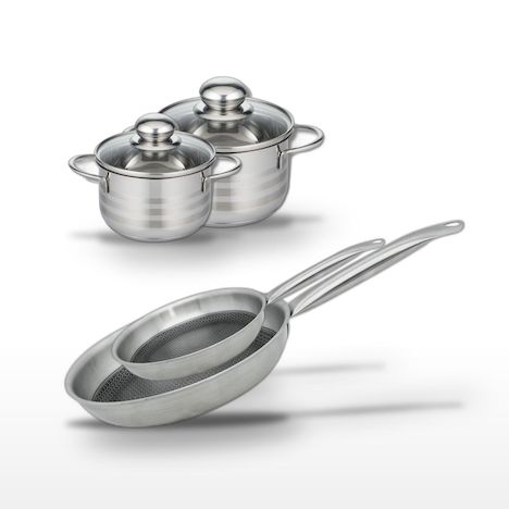 - DESCRIPTION : DESCRIPTION : Ensemble Elo Relief Solution avec poêles 24/28 cm et faitouts 12/14 cm, en acier inoxydable 18/10, revêtement antiadhésif sans PFAS.