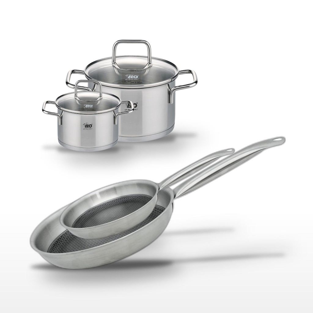 L'ensemble Elo Relief Solution est conçu pour répondre aux exigences des professionnels de la cuisine. Composé de deux poêles (24 cm et 28 cm) et de deux faitouts (14 cm et 20 cm), cet ensemble est fabriqué en acier inoxydable de qualité supérieure. Les poêles sont dotées d'un revêtement antiadhésif ELODUR® Select, sans PFAS, qui assure une cuisson sans accrocs et une facilité de nettoyage inégalée. Les faitouts, avec leur fond capsulé, garantissent une efficacité énergétique optimale et préservent les nutriments de vos ingrédients. Chaque pièce est compatible avec tous les types de feux, y compris l'induction, et peut être utilisée au four jusqu'à 240°C, offrant ainsi une grande flexibilité pour toutes vos préparations culinaires. Le design moderne et fonctionnel de cet ensemble, combiné à la qualité de fabrication allemande d'Elo, en fait un choix judicieux pour les professionnels exigeants et les amateurs passionnés de cuisine.