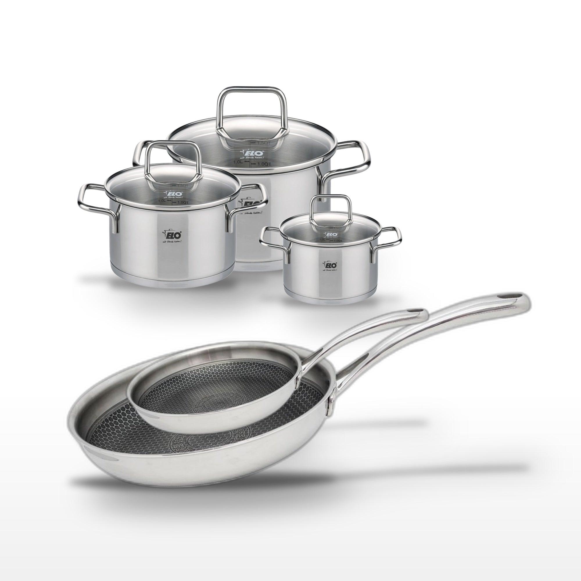 - DESCRIPTION : L'ensemble Elo Relief Evolution combine deux poêles et trois faitouts en inox pour une expérience culinaire optimale. Profitez d'une cuisson homogène et saine.