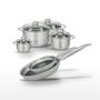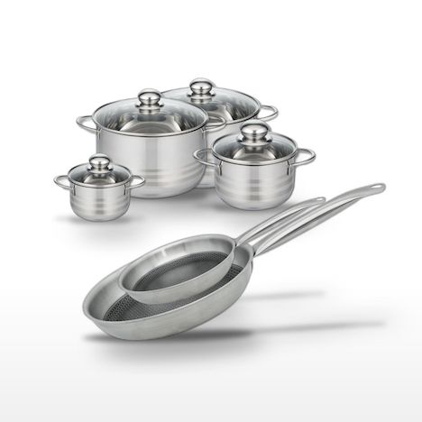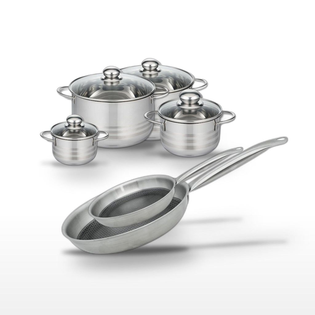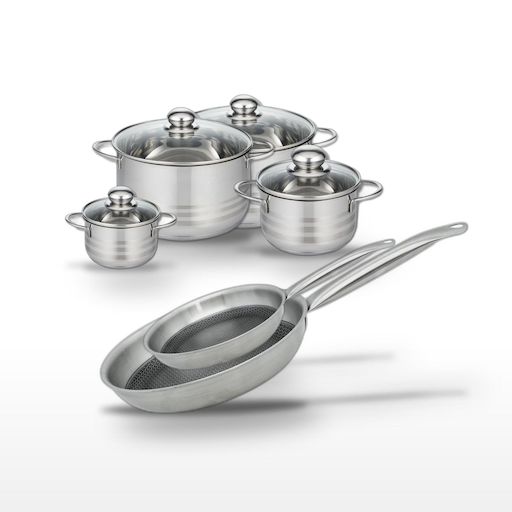 - COMPOSITION : COMPOSITION : Acier inoxydable 18/10, aluminium, revêtement antiadhésif sans PFAS pour les poêles. Faitouts en inox avec couvercle en verre.