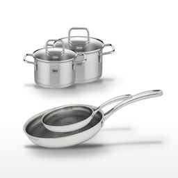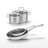 - COMPOSITION : Poêles en acier inoxydable 18/10 avec revêtement ELODUR®, faitouts en acier inoxydable, couvercle en verre.