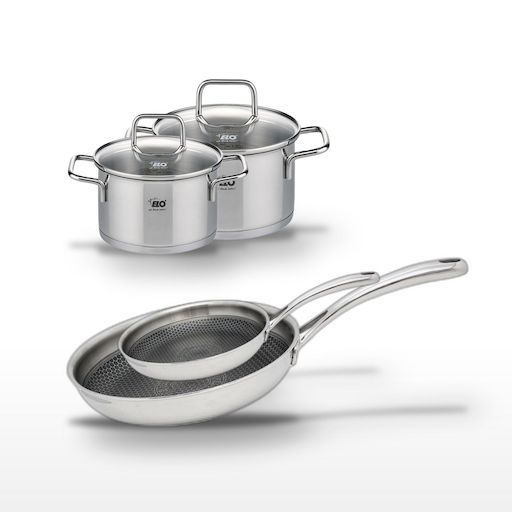 - DESCRIPTION : Le lot Elo Relief Evolution offre deux poêles en inox 18/10 de 24 et 28 cm avec revêtement antiadhésif, et deux faitouts en inox de 14 et 16 cm, pour une cuisine saine et homogène.