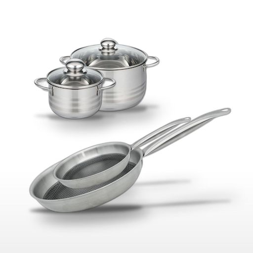 - DESCRIPTION : Ensemble Elo Relief Solution avec 2 poêles et 2 faitouts en acier inoxydable, offrant une cuisson homogène et sans effort grâce à des matériaux de haute qualité.