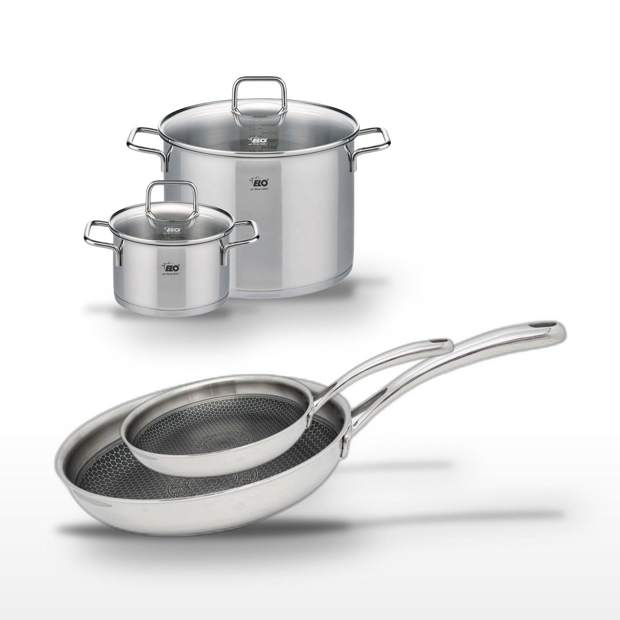 - DESCRIPTION : Ensemble complet de cuisine Elo Relief Evolution avec deux poêles et deux faitouts en inox, alliant performance et élégance.