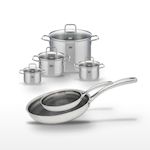 - COMPOSITION : Acier inoxydable 18/10 pour les poêles, inox et verre pour les faitouts, garantissant robustesse et performance.