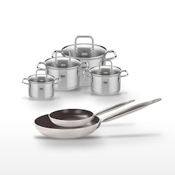 - COMPOSITION : COMPOSITION : Poêles en aluminium avec revêtement céramique, faitouts en acier inoxydable avec couvercles en verre.