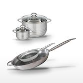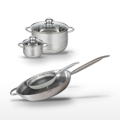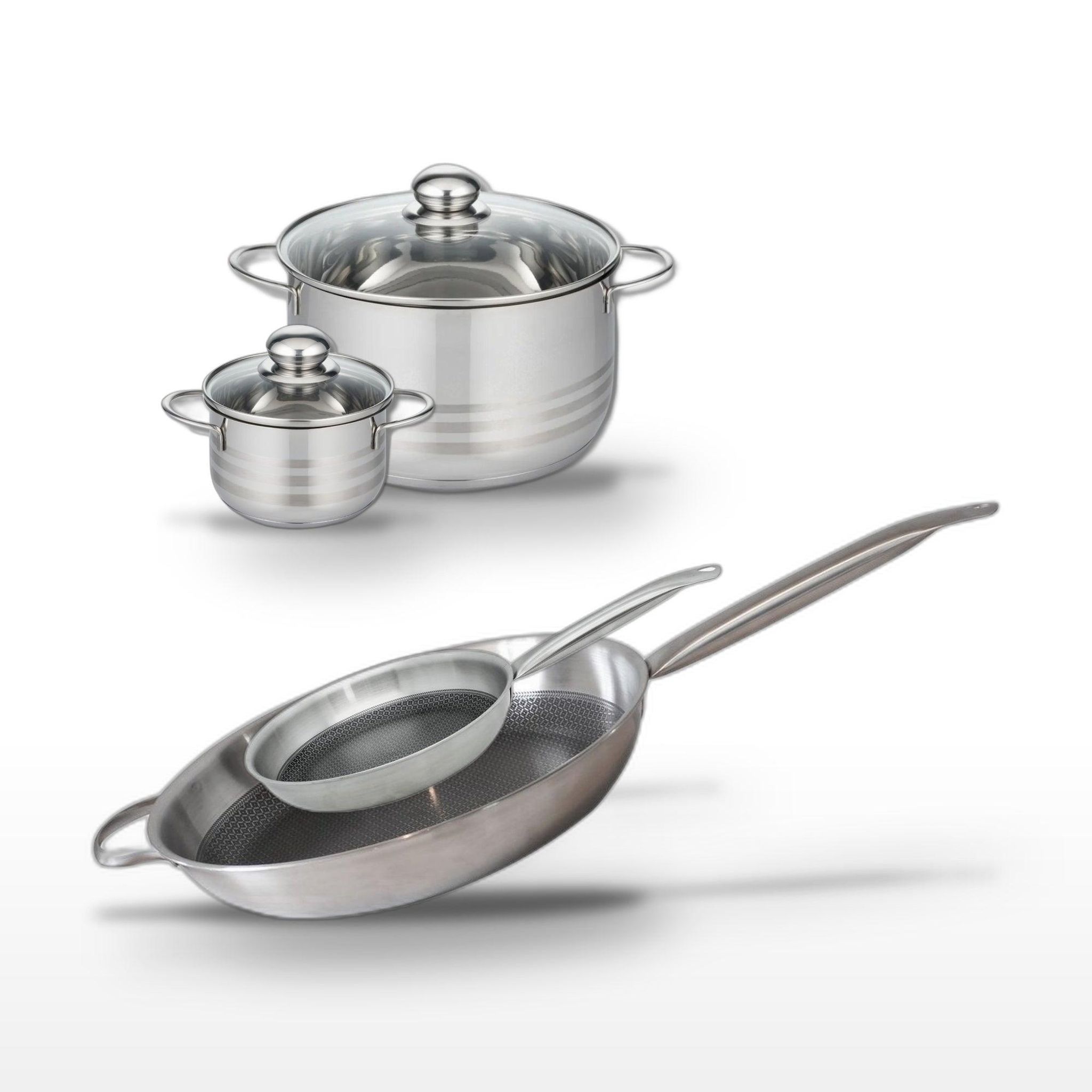 - DESCRIPTION : DESCRIPTION : Lot complet de deux poêles et deux faitouts en acier inoxydable 18/10, avec revêtement antiadhésif sans PFAS, pour une cuisine saine et efficace.