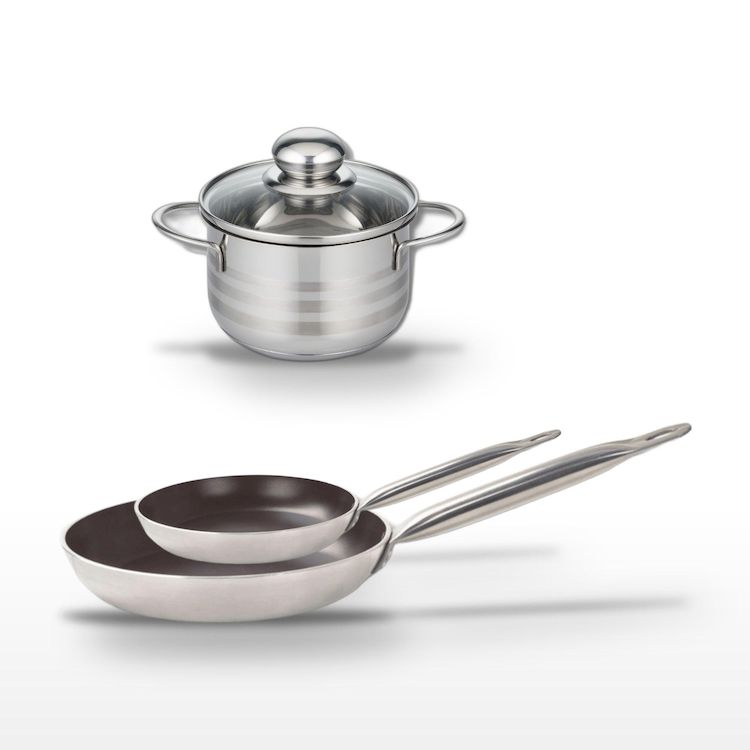 - DESCRIPTION : Le lot Elo inclut deux poêles céramiques de 24 cm et 32 cm et un faitout inox de 14 cm, parfaits pour une cuisson saine et uniforme grâce à leur revêtement sans PFAS.