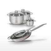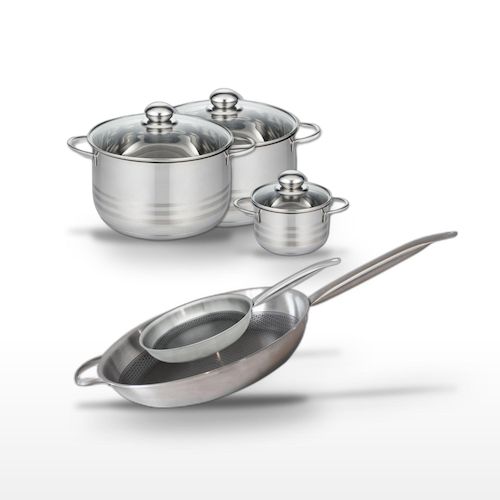 - COMPOSITION : COMPOSITION : Acier inoxydable 18/10 de haute qualité avec revêtement antiadhésif sans PFAS pour les poêles. Faitouts en inox avec fond capsulé économiseur d'énergie pour une cuisson homogène.