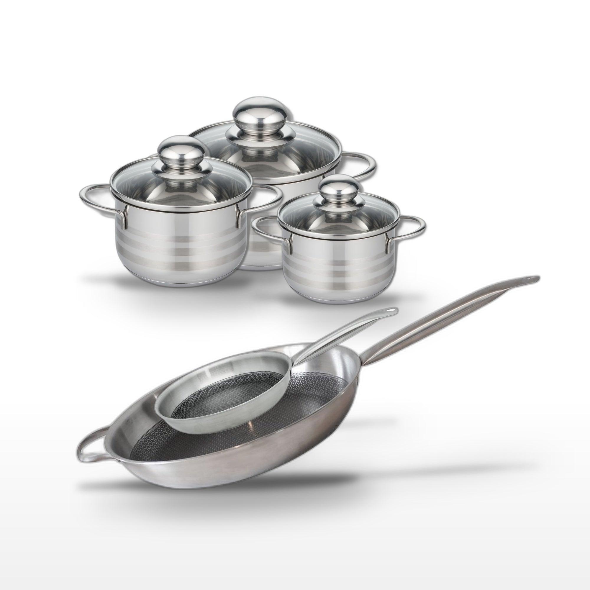 - DESCRIPTION : L'ensemble Elo Relief Solution comprend 2 poêles et 3 faitouts en acier inoxydable 18/10, offrant une cuisson homogène et une grande durabilité.