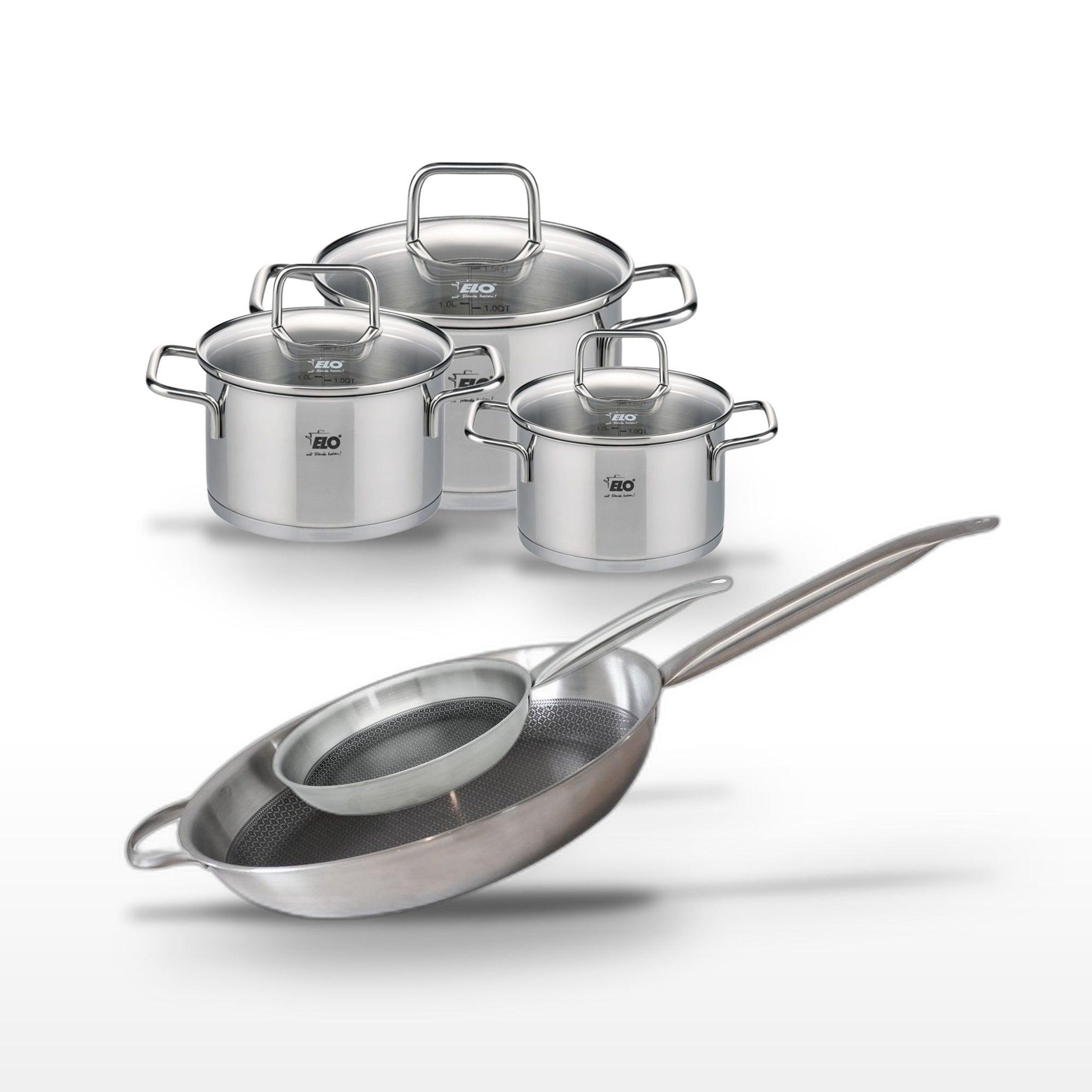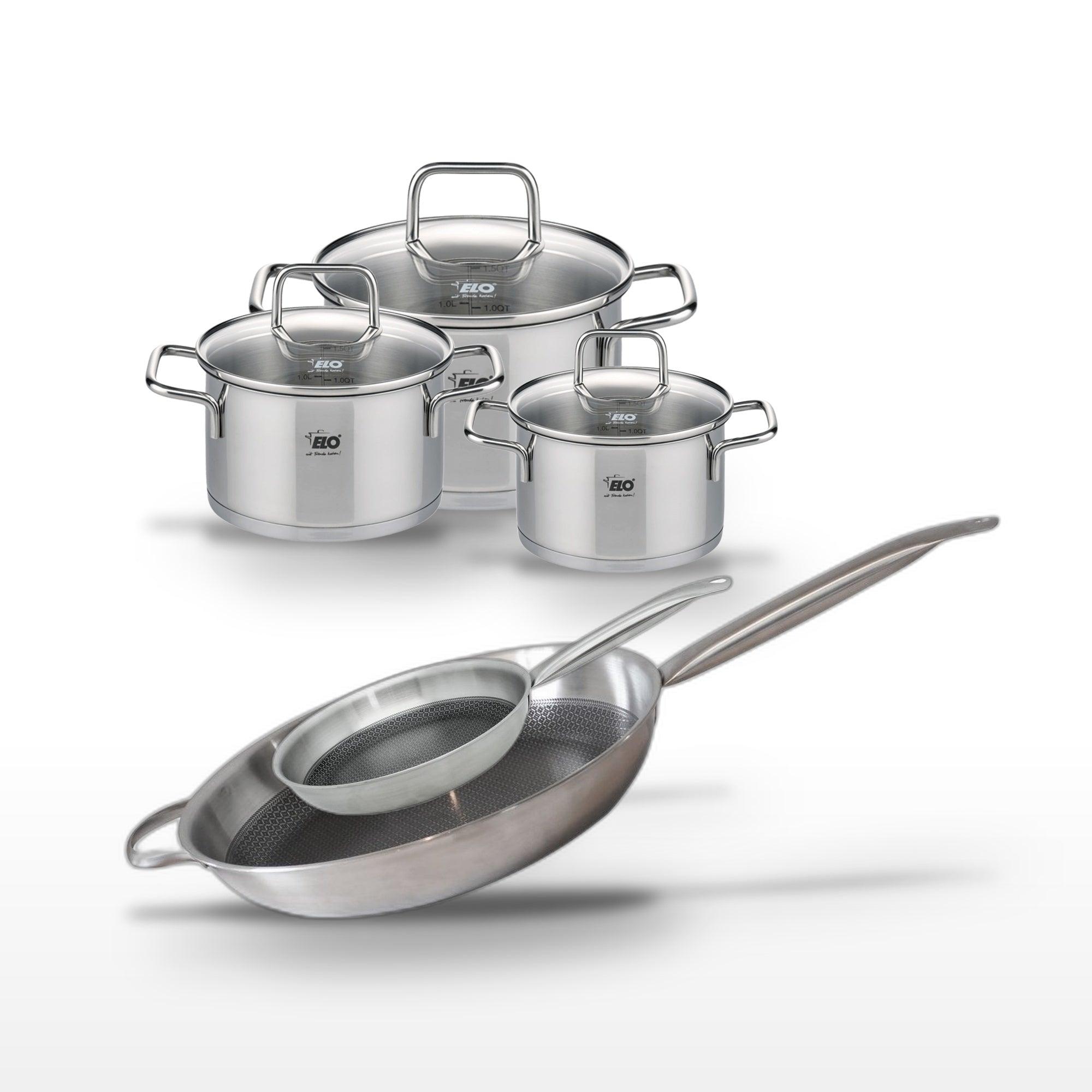 - DESCRIPTION : Lot Elo Relief Solution avec deux poêles en inox 24/32 cm et trois faitouts 14/16/20 cm, pour une cuisine polyvalente et performante.