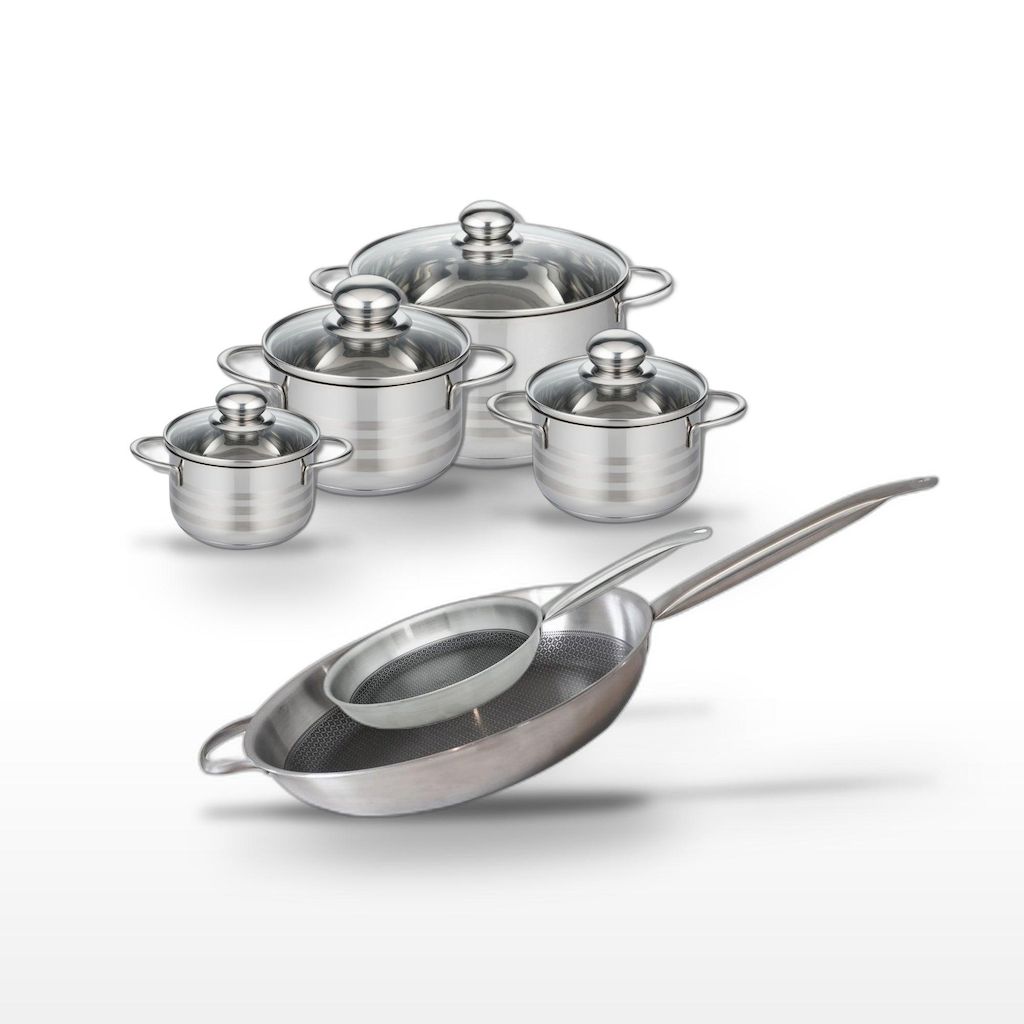 - COMPOSITION : Poêles en acier inoxydable 18/10 et aluminium avec revêtement ELODUR® Select. Faitouts en inox de haute qualité, tous sans PFAS, garantissant une cuisine saine et sans risque.