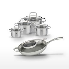 - COMPOSITION : Acier inoxydable 18/10 pour les poêles, avec revêtement ELODUR®. Faitouts en inox avec couvercles en verre.