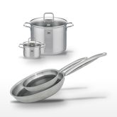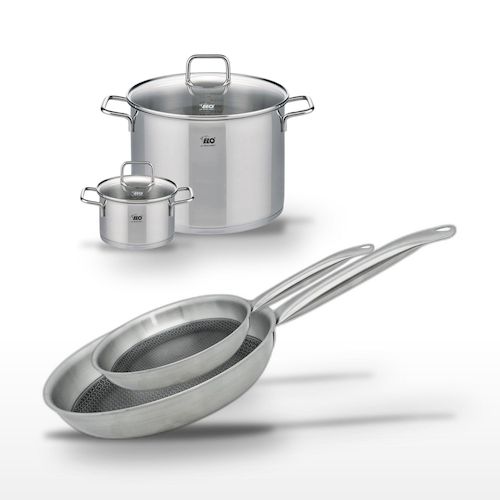 - DESCRIPTION : DESCRIPTION : Ensemble Elo Relief Solution avec deux poêles en inox 28 cm et 24 cm, et deux faitouts 26 cm et 16 cm, pour une cuisson homogène.