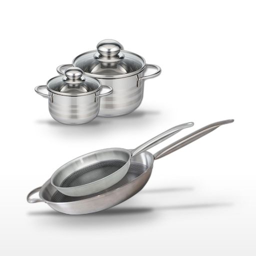 - DESCRIPTION : Lot Elo Relief Solution avec 2 poêles et 2 faitouts en acier inoxydable, pour une cuisson homogène et une cuisine saine.