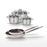DESCRIPTION : Le lot Elo Bistro Line inclut deux poêles en céramique de 28 cm et 32 cm, ainsi que trois faitouts en inox de 14 cm, 16 cm et 20 cm, tous sans PFAS pour une cuisson saine.PETIT + : Revêtement antiadhésif ELODUR® Select pour une cuisson sans matière grasse et nettoyage facile. Poignées