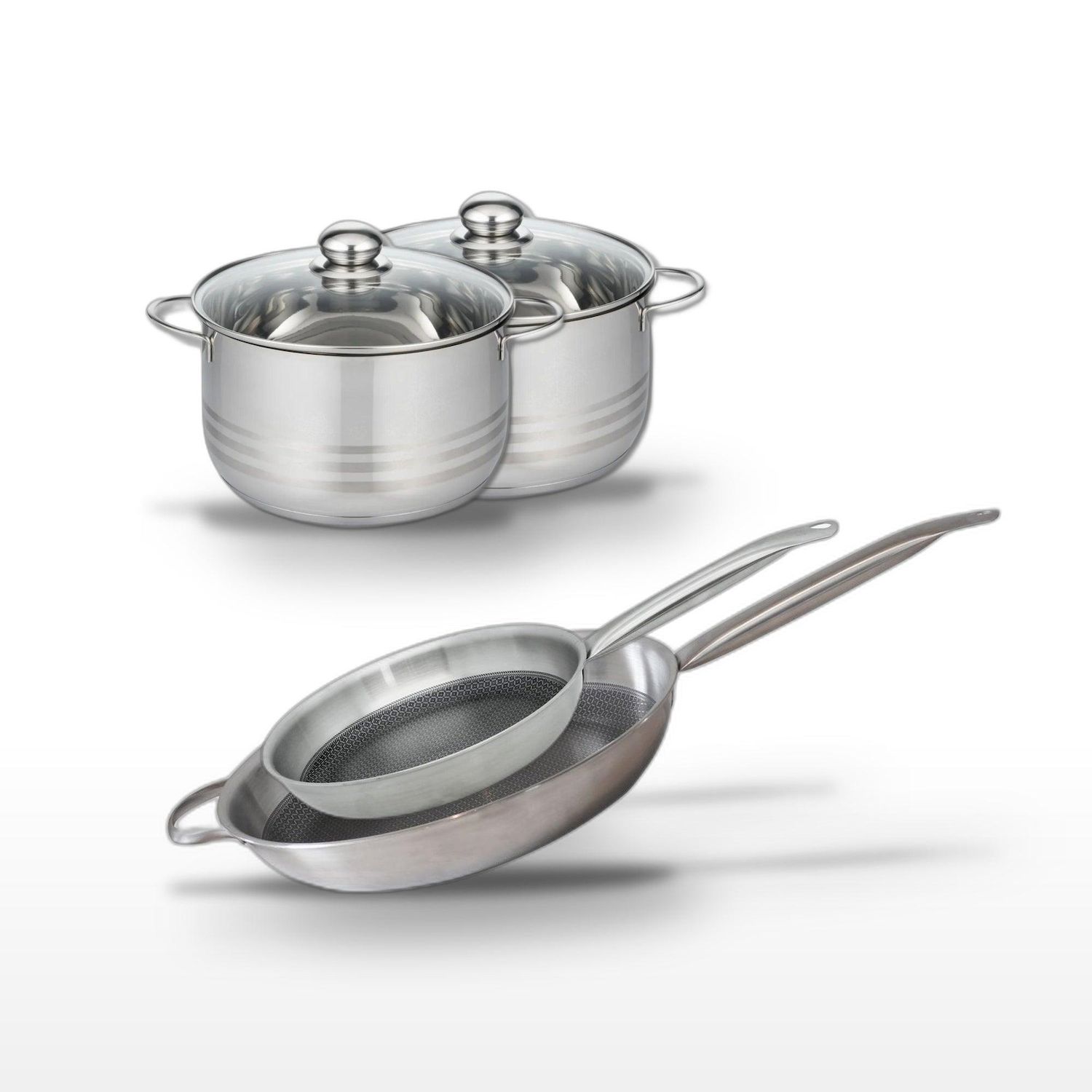 - DESCRIPTION : DESCRIPTION : Ensemble de cuisine Elo Relief Solution comprenant deux poêles et deux faitouts en acier inoxydable, pour une cuisine saine et performante.