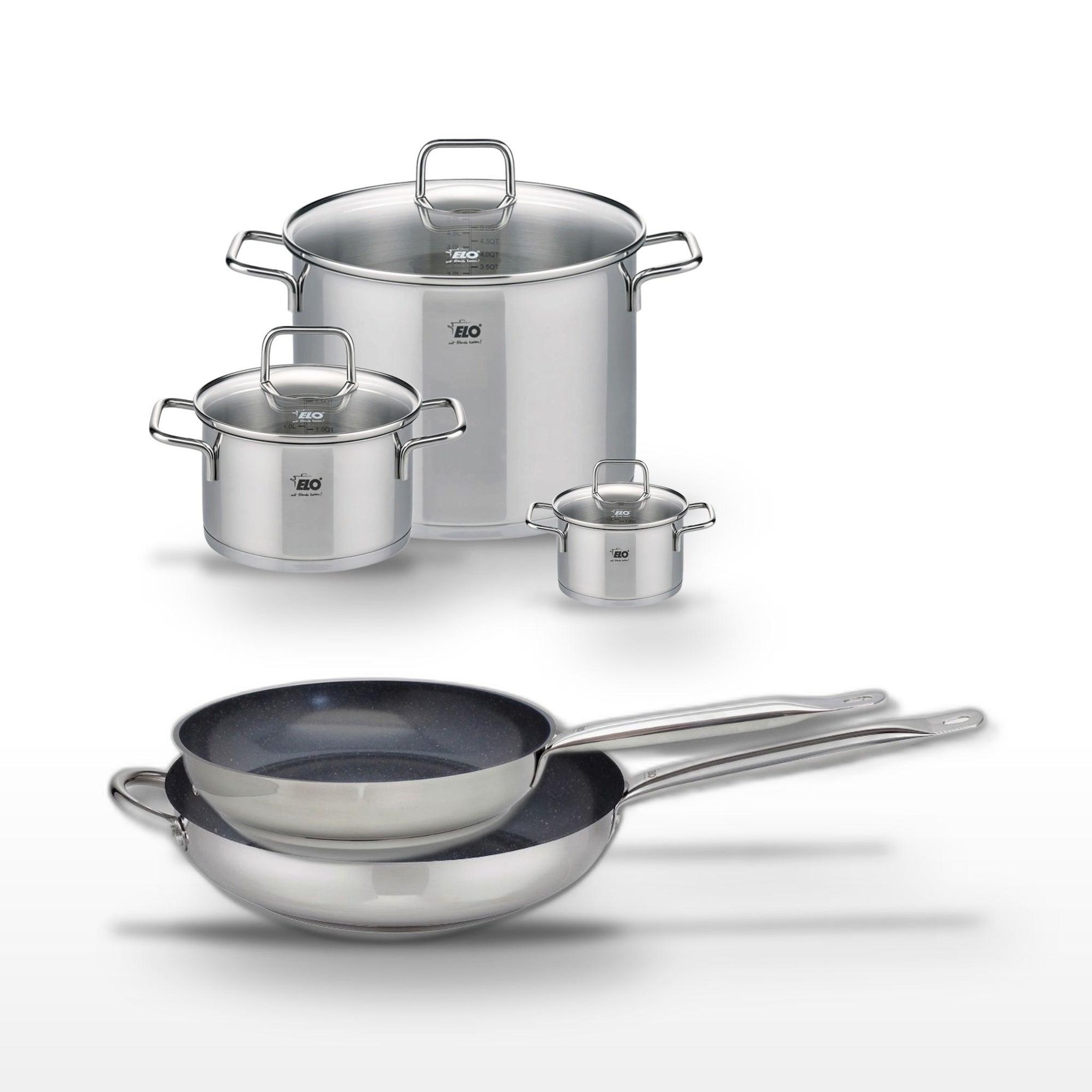 - DESCRIPTION : DESCRIPTION : Ce lot Elo Profi Therm Platinum inclut deux poêles céramique sans PFAS de 28 cm et 32 cm, et trois faitouts en inox de 12 cm, 20 cm et 26 cm, garantis pour une cuisson saine.