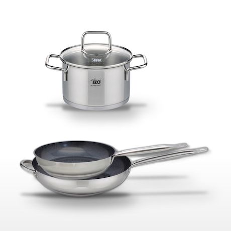 - DESCRIPTION : Cet ensemble Elo comprend deux poêles céramiques sans PFAS de 28 cm et 32 cm, offrant une cuisson saine et uniforme, ainsi qu'un faitout en inox de 12 cm idéal pour les petites portions.