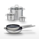 - COMPOSITION : COMPOSITION : Poêles en acier inoxydable avec revêtement céramique sans PFAS, faitouts en acier inoxydable avec couvercles en verre.