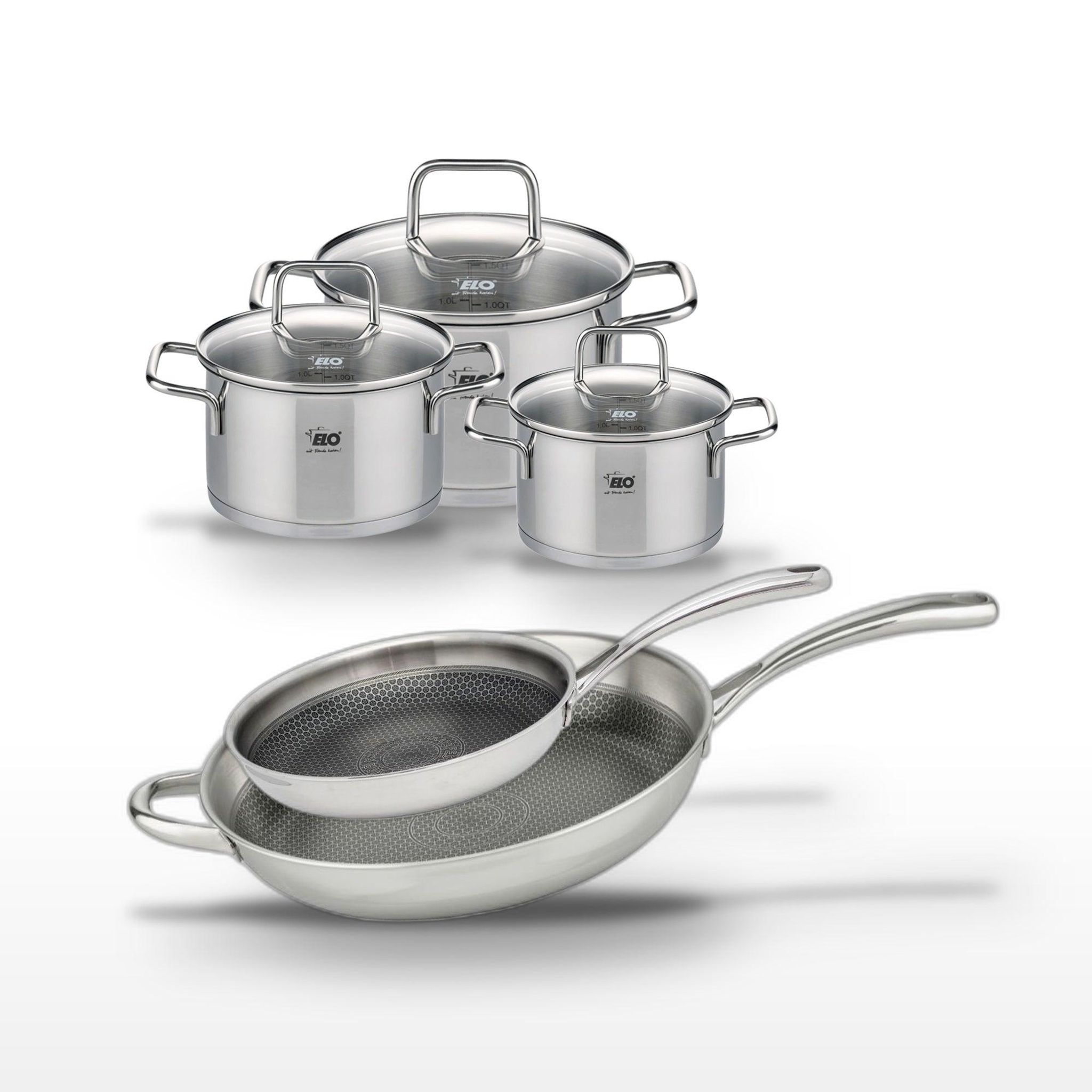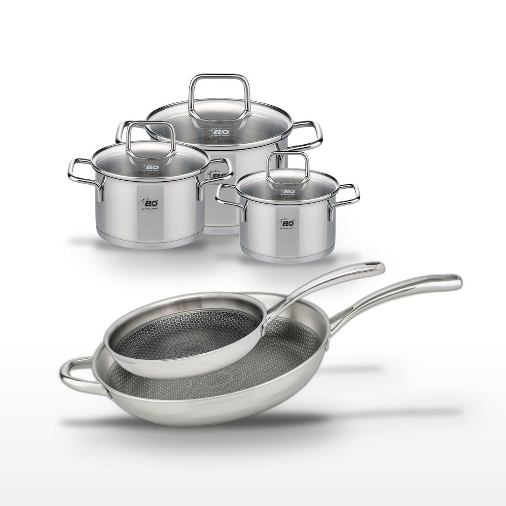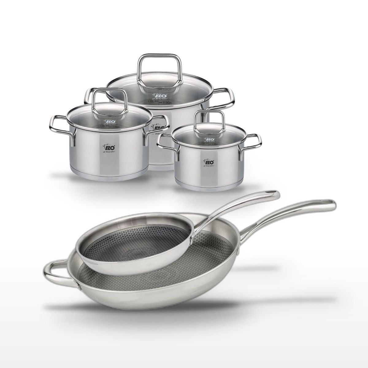 - DESCRIPTION : Profitez d'une cuisson optimale avec cet ensemble Elo comprenant deux poêles en inox et trois faitouts. Idéal pour cuisiner sainement et efficacement.
