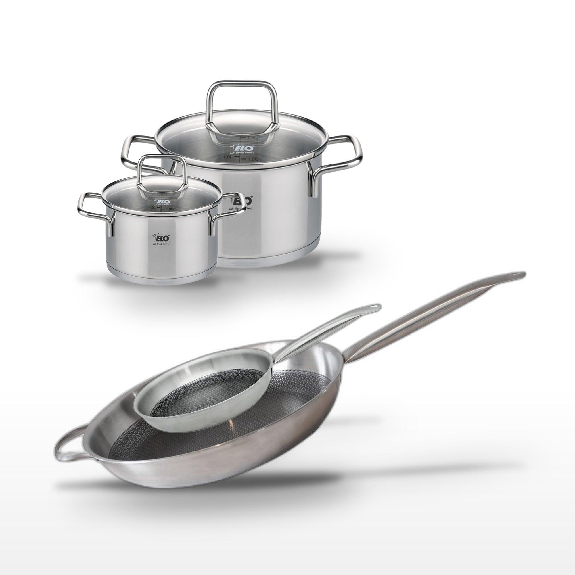 - DESCRIPTION : DESCRIPTION : Ensemble de 2 poêles et 2 faitouts Elo Relief Solution en acier inoxydable, revêtement antiadhésif ELODUR® Select.