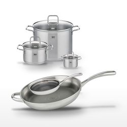 - COMPOSITION : Acier inoxydable 18/10 pour les poêles et faitouts, avec un revêtement antiadhésif pour les poêles et un fond capsulé pour les faitouts.
