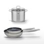 - COMPOSITION : Acier inoxydable 18/10, revêtement sans PFAS pour les poêles, couvercle en verre pour le faitout.