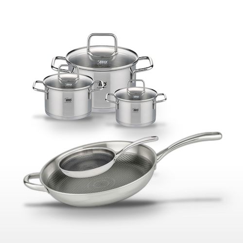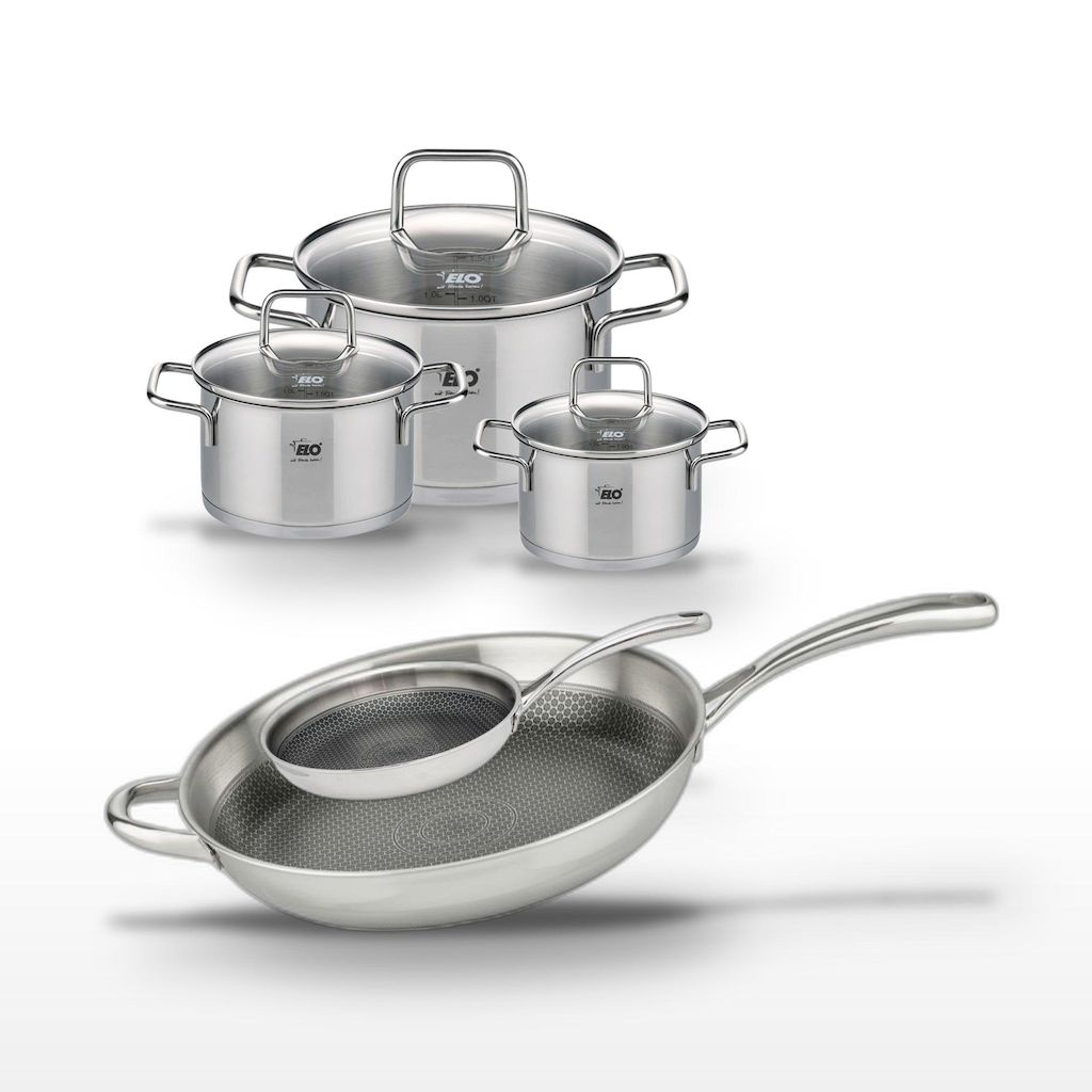 - DESCRIPTION : L'ensemble Elo combine deux poêles antiadhésives et trois faitouts en inox, parfaits pour une cuisine variée et saine.