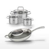 - COMPOSITION : Acier inoxydable 18/10 pour les poêles, aluminium pour la répartition de chaleur, verre pour les couvercles des faitouts.