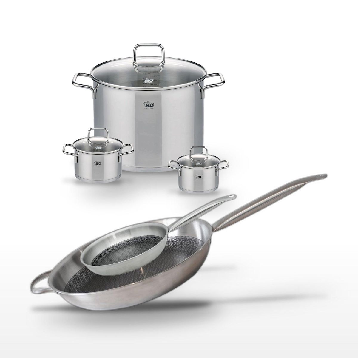 - DESCRIPTION : DESCRIPTION : Ensemble complet de faitouts et poêles Elo Relief Solution en acier inoxydable, pour une cuisson homogène et économe en énergie.