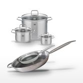 - COMPOSITION : Acier inoxydable 18/10, aluminium, verre pour les faitouts , revêtement antiadhésif pour les poêles.