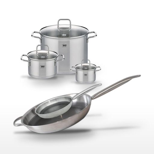 - DESCRIPTION : Profitez d'une cuisine polyvalente avec cet ensemble Elo Relief Solution, comprenant trois faitouts et deux poêles en acier inoxydable.