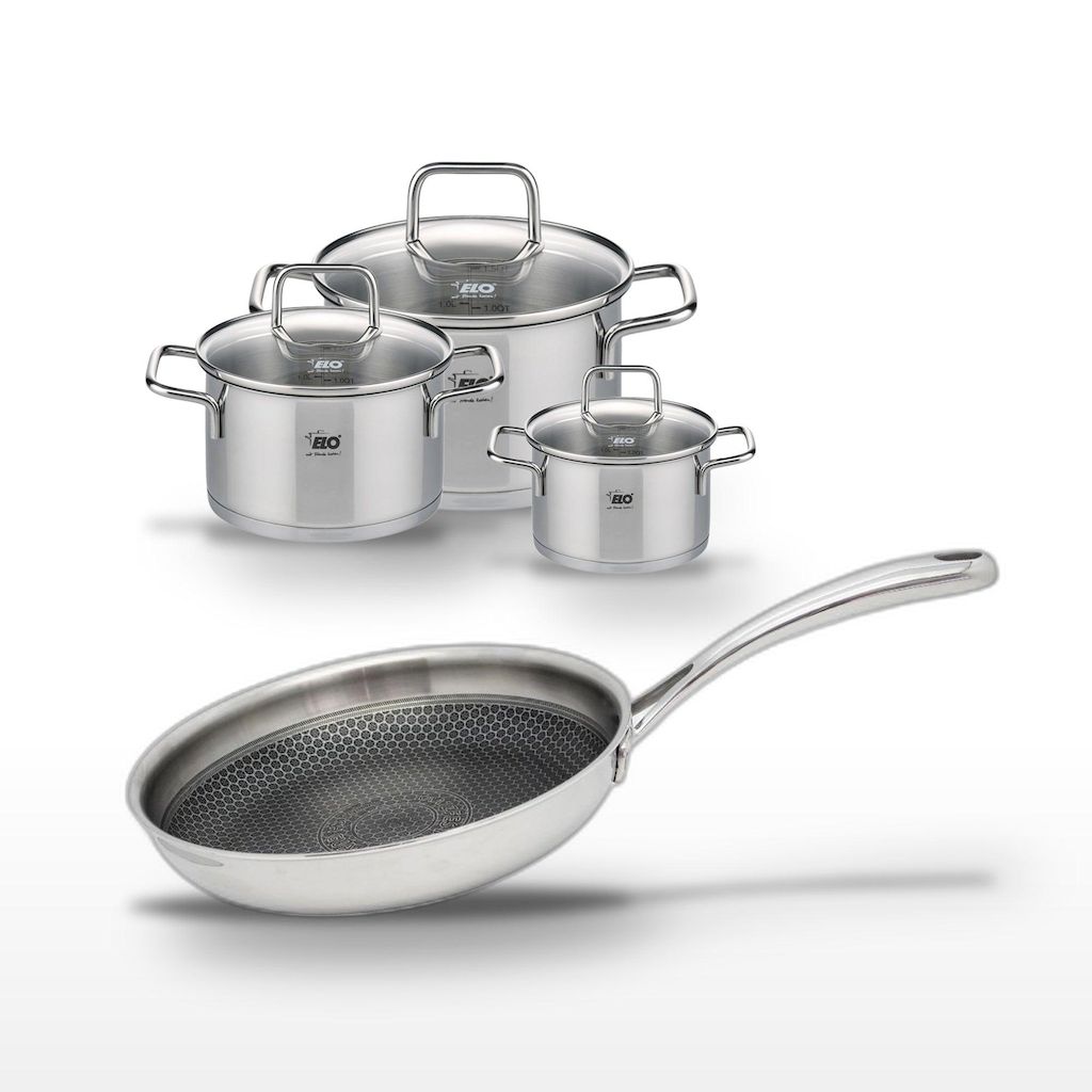 - DESCRIPTION : DESCRIPTION : Ce lot Elo Relief Evolution est composé de trois faitouts en inox et d'une poêle, parfaits pour une cuisson homogène et efficace.