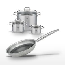 - PETIT + : Profitez d'une cuisson homogène et économe en énergie grâce aux fonds capsulés des faitouts et au revêtement ELODUR® de la poêle.