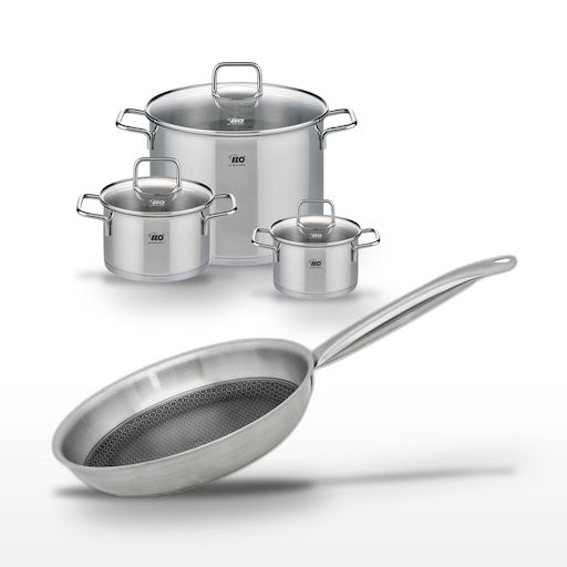 - DESCRIPTION : L'ensemble Elo Relief Solution inclut 3 faitouts en inox et une poêle avec revêtement antiadhésif, parfaits pour une cuisine variée et saine.