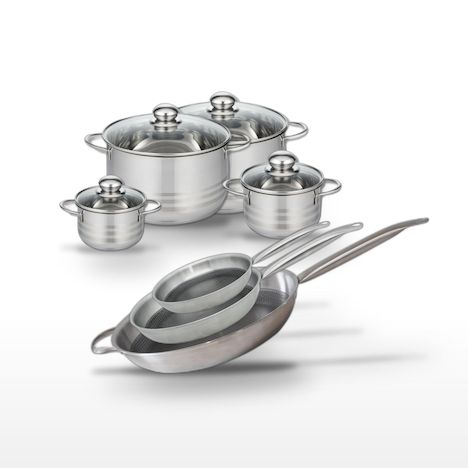 - DESCRIPTION : Lot complet de 3 poêles et 4 faitouts en acier inoxydable Elo Relief Solution, pour une cuisine saine et performante.